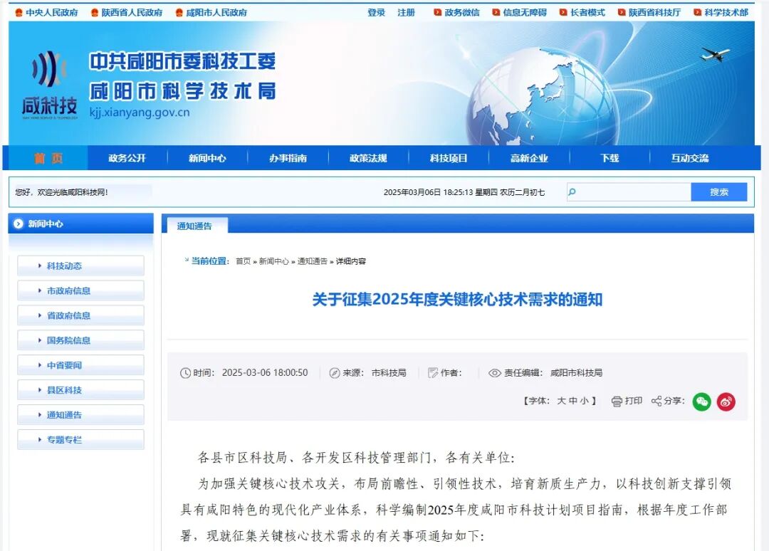 咸阳市科学技术局关于征集2025年度关键核心技术需求的通知
