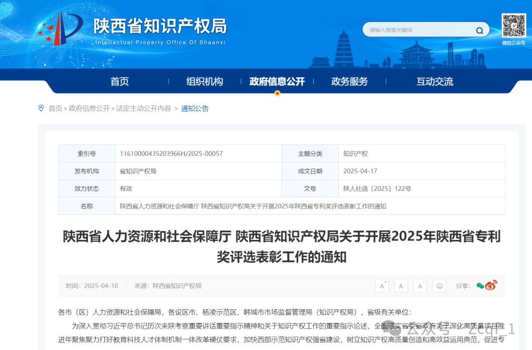 为深入贯彻习近平总书记历次来陕考察重要讲话重要指示精神和关于知识产权工作的重要指示论述,全面落实省委省政府关于深化高质量项目推进年聚焦聚力打好教育科技人才体制机制一体改革硬仗要求,加快西部示范知识产权强省建设,树立知识产权高质量创造和高效益运用典范,促进专利转化实施和保护,经省委功勋荣誉表彰工作工作专班办公室批复同意,省人力资源和社会保障厅、省知识产权局决定开展2025年陕西省专利奖评选表彰工作。现就有关事项通知如下。
