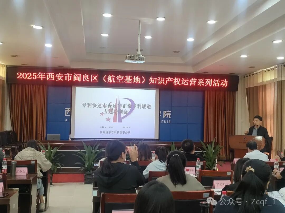 2025年4月24日,由西安市市场监督管理局指导、阎良区市场监督管理局与西安航空职业技术学院联合承办的“2025年西安市阎良区(航空基地)知识产权运营系列活动”在西安航空职业技术学院成功举办。臻萃企服子公司-陕西瑧萃专利代理事务所作为特邀服务机构,以“专业快速审查及非正常专利规避”为主题,为现场企业带来了一场理论与实践深度融合的知识产权赋能。