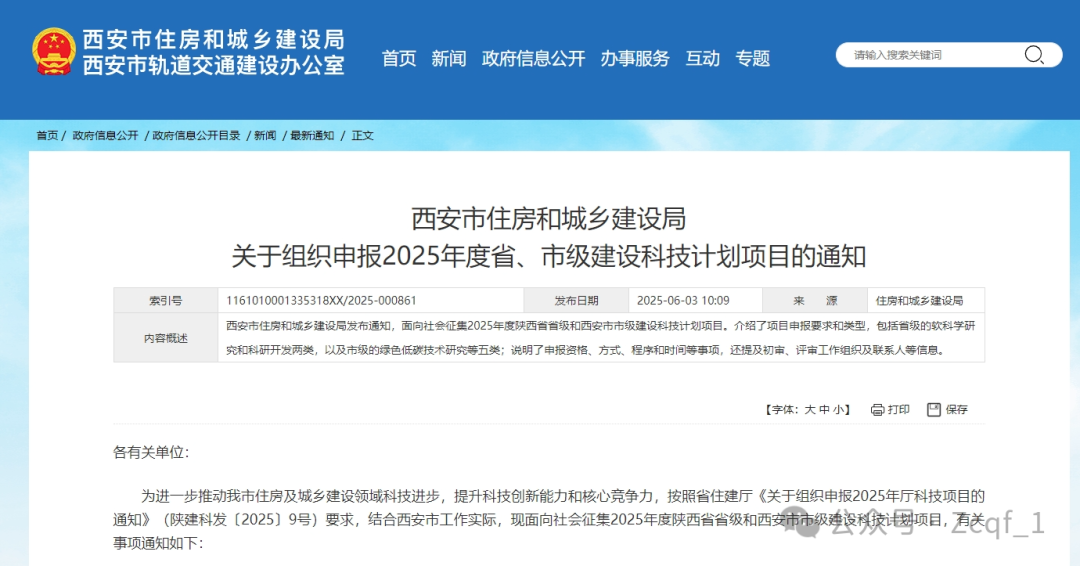 各有关单位: 为进一步推动我市住房及城乡建设领域科技进步,提升科技创新能力和核心竞争力,按照省住建厅《关于组织申报2025年厅科技项目的通知》(陕建科发〔2025〕9号)要求,结合西安市工作实际,现面向社会征集2025年度陕西省省级和西安市市级建设科技计划项目,有关事项通知如下: 01|项目申报要求和类型 申报内容应聚焦支撑引领住房和城乡建设绿色发展和高质量发展需求,面向“工业化、数字化、智能化、绿色化”方向,属于住房城乡建设科技发展重点技术领域和重点支持范围,符合国家和省住房城乡建设科技相关政策,创新性强,具有较强的推广和应用价值,对促进产业结构调整和优化升级有积极作用。 (一)省级项目类型 主要包括软科学研究和科研开发两大类,采用“揭榜选题项目”和“自主选题项目”相结合的方式申报。 1.揭榜选题项目。省住建厅已确定选题清单并在官网发布。该类项目按选题清单及相关要求申报。 2.自主选题项目。由申报单位根据行业技术发展的实际情况申报。 (1)软科学研究类项目。重点研究与住房和城乡建设行业高质量发展密切相关,以解决实际问题、为管理决策提供科学依据,促进管理理念和管理模式创新的战略性、前瞻性和政策性问题。主要包括:城乡建设管理、建筑业转型发展、房地产和住房保障、住宅品质提升、智慧小区管理、物业服务质量提升、城市综合治理(住房和城乡建设领域)、碳达峰碳中和、“可再生能源+建筑”、韧性城市、村镇高质量发展等方面。 (2)科研开发类项目。重点围绕住房及城乡建设科技高质量发展的重点技术领域。主要包括:工程质量安全、防灾减灾(住房和城乡建设领域)、建筑品质提升、既有建筑改造、建筑节能与绿色建筑、智能建造与新型建筑工业化、海绵城市建设、地下综合管廊建设、城市轨道交通建设、市政公共基础设施建设、城市地下空间开发利用、美丽宜居乡村建设、城市精细化管理(住房和城乡建设领域)、城镇老旧小区改造、历史建筑保护利用、新型城市基础设施建设、“可再生能源+建筑”、韧性城市、建筑信息模型(BIM)和城市信息模型(CIM)及信息化技术等。 (二)市级项目类型 1.绿色低碳技术研究。主要包括:城乡建设领域“碳达峰、碳中和”相关技术研究;建筑全寿命周期碳排放性能研究;装配式建筑与低能耗建筑关键技术研究;绿色低碳建材研发。 2.智能建造新技术应用。主要包括:智能建造在建设工程中的应用;智能建造在城市更新项目中的应用;建筑机器人及智能建造装备研发与应用;住宅工业化建造关键技术攻关及应用,物联网技术在建筑业中的应用。 3.可再生能源建筑一体化应用。主要包括:建筑太阳能光伏一体化技术;太阳能光热、光电、地热能、空气热能等清洁可再生能源的综合利用技术研究和应用,建筑及城市照明设施节能新技术研发与应用。 4.城市基础设施高质量发展。主要包括:城市基础设施建设、节能降碳、减排等关键技术研究,市政基础设施微更新、微改造技术路径研究,城市基础设施建设中绿色低碳技术体系、标准体系的构建及相应“四新技术”研究。 5.韧性城市及新型安全管理模式。主要包括:韧性城市建设技术研究;建筑施工风险管控技术及建设领域安全管理创新技术研究。 02|申报资格和要求 (一)省级项目申报单位应为省内注册的独立法人,且具有较强的研究开发实力和组织协调能力,鼓励以企业为主体、产学研用相结合,跨地区、跨行业等方式联合申报。 (二)市级项目申报单位原则上应为在西安市行政区域内(含西咸新区)注册的独立法人。注册地在外省市但在西安市有分支机构的独立法人,研究方向或应用以西安市住房城乡建设发展领域或相关项目为依托的单位,也可申报。 (三)申报单位应在所申报的项目领域具有良好的研究基础和科研实力,不得挂名申报。项目负责人原则上应为项目主体研究思路的提出者和实际主持研究人员,并在项目结题前在职。 (四)申报单位应拥有相关技术的自主知识产权,承诺申报材料内容真实、不含涉及国家秘密和商业秘密的内容。 (五)项目研发经费由申报单位自筹。 (六)省级项目实施周期一般不超过3年,市级项目实施周期一般不超过2年。 (七)项目的申报材料应注重质量,突出重点,经申报单位严格审查通过后上报。申报单位对项目的真实性等负责。 03|申报方式和程序 (一)申报方式 1.申报项目均应填写《建设科技项目诚信承诺书》(附件1)。 2.省级计划项目填写《陕西省住房和城乡建设厅软科学研究类项目申报书》《陕西省住房和城乡建设厅科研开发类项目申报书》(省住建厅官网下载)。 3.市级计划项目填写《西安市建设科技计划项目申报书》(附件2) 4.纸质版(加盖公章)申报书一式五份,承诺书一式三份,统一报送至市住建局节能与科技处(雁塔南路300-9号)1606室。 5.电子版(Word或PDF格式)发送至邮箱szjjjnc@163.com (二)申报程序 1.省级计划项目,由市住建局组织初审后,择优推荐至省住建厅。部省直属有关单位、省管行业学(协)会,中省国资委管理的有关企业可直接向省住建厅申报。 2.市级计划项目,市住建局受理后,开展立项评审及公示,对符合条件的项目列入《2025年西安市建设科技项目计划》。 3.一个项目可同时申报省、市级建设科技计划。 (三)申报时间 请相关单位于2025年7月11日