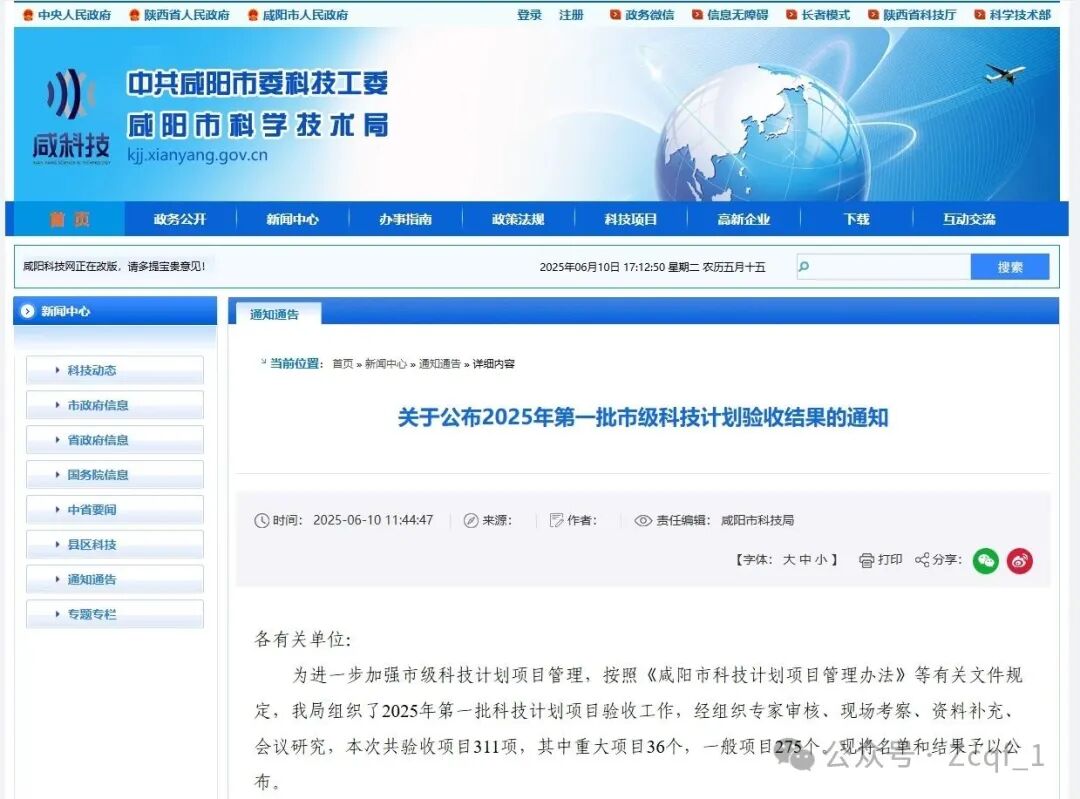 各有关单位:为进一步加强市级科技计划项目管理,按照《咸阳市科技计划项目管理办法》等有关文件规定,我局组织了2025年第一批科技计划项目验收工作,经组织专家审核、现场考察、资料补充、会议研究,本次共验收项目311项,其中重大项目36个,一般项目275个。现将名单和结果予以公布。附件:2025年第一批市级科技计划验收结果.docx